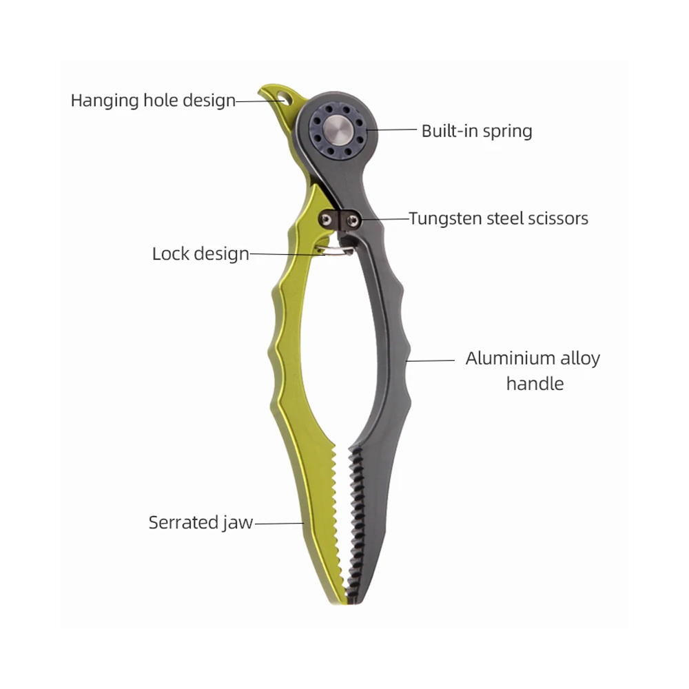 Fish grip τύπου “λαβίδα” από την Atisen, με κομψό σχεδιασμό αλουμινίου που προσφέρει σταθερότητα και αντοχή. Με πριονωτή λαβή (serrated jaw) για σταθερό κράτημα των ψαριών, ενσωματωμένο κόφτη για σύρμα ή πετονιά, καθώς και ελατήριο επιστροφής για εύκολη χρήση με το ένα χέρι, εξασφαλίζει άνεση και αποτελεσματικότητα σε κάθε ψάρεμα, ενώ το ελαφρύ αλλά ανθεκτικό σώμα από αλουμίνιο εξασφαλίζει μακροχρόνια χρήση χωρίς φθορά.