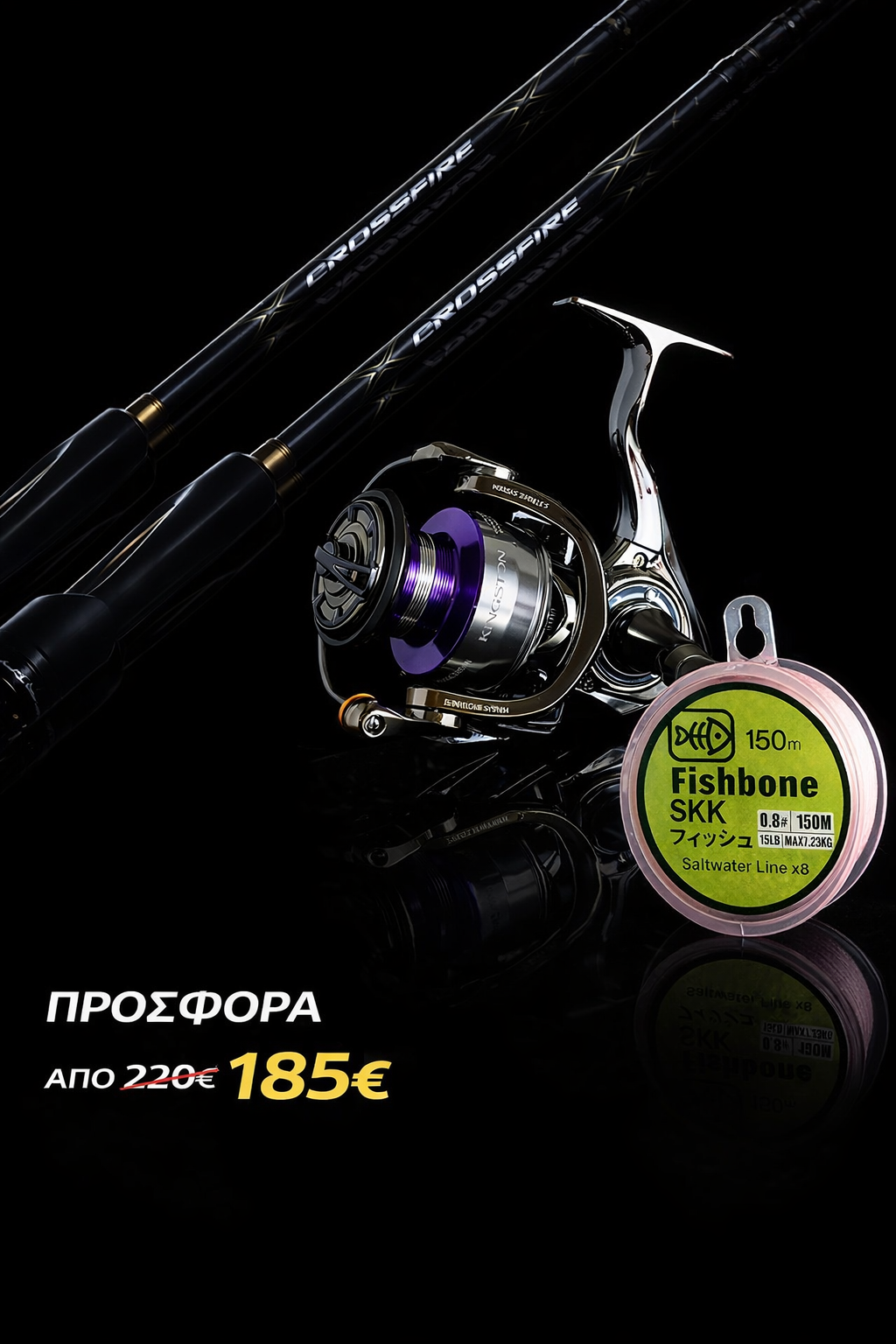 Original price was: 260,00 €.220,00 €Η τρέχουσα τιμή είναι: 220,00 €.Combo LRF Eupro CROSSFIRE X LRF + Eupro Kingston 2000 + Fishbone SKK Greencolor braided PE line 150mt