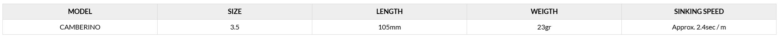 Αρχικά οι πρώτες καλαμαριέρες για ψάρεμα από την ακτή, κατασκευάστηκαν ως απομίμηση της γαρίδας οπότε η Camberino αποτελεί την συνέχεια αυτής της ιαπωνικής παράδοσης με σχήμα και εμφάνιση γαρίδας. Η διαφορά της από τις άλλες αντίστοιχης μορφής καλαμαριέρες είναι το έρμα το οποίο της δίνει απίστευτη κίνηση μέσα στο νερό αλλά και το κατάλληλο βάρος για να μπορούμε να την στείλουμε μακριά. Πολύ χρήσιμη επίσης για όσους ψαρεύουν από σκάφος με θέση μπροστά στο έρμα για πρόσθεση έξτρα βάρους.