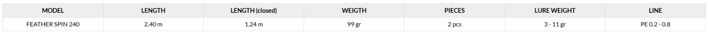 Το Feather Spin 240 είναι ένα πολύ χρήσιμο LRF καλάμι καθώς η γρήγορη επαναφορά του σε συνδυασμό με την παραβολική δράση του, μας δίνει την δυνατότητα να ψαρέψουμε πολύ καλά στο βυθό με σιλικόνες και βιοδιασπώμενα ενώ παράλληλα μπορούμε να χειριστούμε με άνεση μικρά πλανάκια και topwater τεχνητά. Η μοναδική αυτή συμπεριφορά επιτυγχάνεται επειδή το καλάμι είναι κατασκευασμένο από Nano Plus carbon. Διαθέτει K οδηγούς που προσφέρουν μεγάλη ρίψη ακόμα και με δολώματα κάτω των πέντε γραμμαρίων!