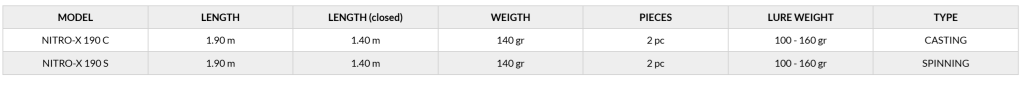 To Nitro-x είναι σχεδιασμένο για την τεχνική του slow jigging . Eίναι αρκετά γρήγορο με έντονη δύναμη επαναφοράς που κινητοποιεί τον πλάνο με ελάχιστη προσπάθεια ακόμα και σε βαθιά νερά. Το Nitro-x ζυγίζει ελάχιστα με βάρος μόλις 140gr και είναι εξοπλισμένο με εξαιρετικής ποιότητας οδηγούς και βάση στήριξης μηχανισμού της εταιρείας Fuji. To carbon του spiral core είναι πανίσχυρο και προσφέρει 20% παραπάνω παραβολή από αντίστοιχα καλάμια, διατηρώντας την δύναμη του!!! Διατίθεται σε δύο μοντέλα, casting type και spinning type ανάλογα με τις ανάγκες σας και σε προσιτή τιμή!