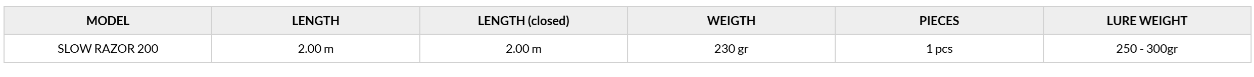 Η Oceanic Team παρουσιάζει για το 2021 μια νέα σειρά καλαμιών για την τεχνική του slow jigging με την ονομασία “Slow Game” η οποία απαρτίζεται από δύο μοντέλα : το Slow Artist & το Slow Razor. Το Slow Razor κατασκευάστηκε με γνώμονα την ανάγκη για ένα καλάμι ελαφρύ με λεπτό blank που θα μπορεί να διαχειριστεί όλα τα βαριά δολώματα της τεχνικής αλλά το κυριότερο να χειριστεί με επιτυχία τις πιο δύσκολες μάχες στα μεγάλα βάθη. Είναι κατασκευασμένο από carbon spiral core με σταυρωτή πλέξη ώστε να μπορεί να αντέχει στις καταπονήσεις μιας μάχης ακόμα και με ψάρια του βυθού όπως ροφοί, στείρες και άλλα. Παράλληλα, η επιλογή αυτού του υλικού του προσδίδει ημιπαραβολική δράση που βοηθάει τόσο στην ανάκτηση του ψαριού όσο και στο χτύπημα των πλάνων. Τέλος, οι υψηλής ποιότητας Fuji MN οδηγοί εξασφαλίζουν την ομαλή ροή του νήματος και την αποφυγή μπλεξιμάτων και μάλιστα οι τρεις μεγαλύτεροι είναι διστήριχτοι ώστε να προσδίδουν μεγαλύτερη δύναμη στο butt. Με μήκος δύο μέτρα και lure weight 250-300gr, αναμφίβολα το Slow Razor είναι ένα πολύ αξιόπιστο καλάμι στην κατηγορία του που θα γίνει το αγαπημένο όλων, όχι μόνο για την συμπεριφορά του αλλά και για την πολύ καλή τιμή του!