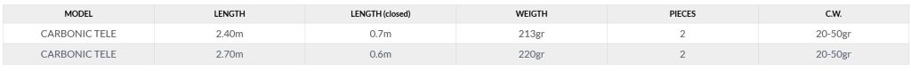 Κατασκευασμένο από μίξη carbon και fiberglass, το Carbonic Tele απευθύνεται σε όσους είναι λάτρεις του ψαρέματος με raglou και buldo ή μπομπάρδα. Μιλάμε για μια ευρεία σειρά από εύκολα στη μεταφορά spinning τηλεσκοπικά καλάμια. Αυτά τα καλάμια γενικής χρήσης μπορούν να χρησιμοποιηθούν τόσο από την ακτή όσο και από σκάφος χρησιμοποιώντας μεσαίου μεγέθους τεχνητά δολώματα.